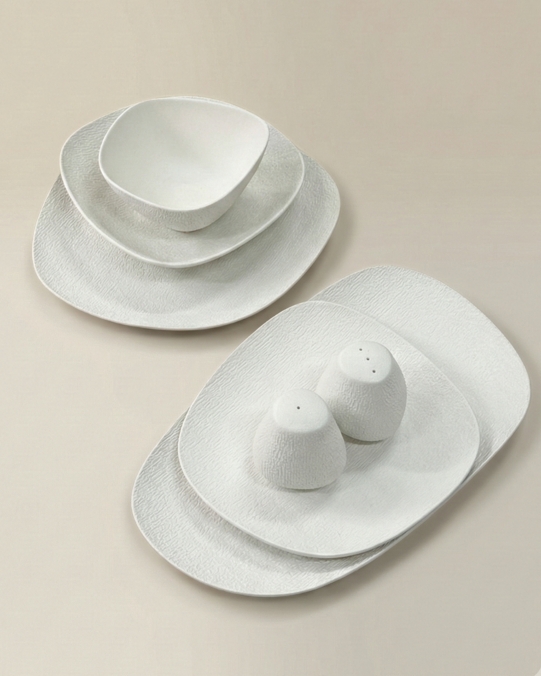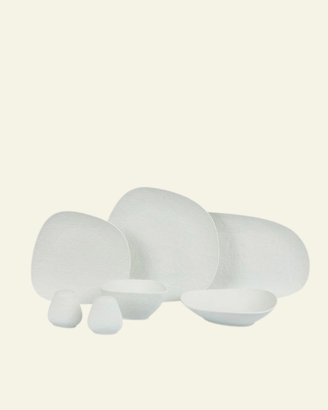 Tillverkat i tåligt porslin med modern form – perfekt för att lyfta både vardagsmiddagar och festdukningar. De generösa skålarna och det eleganta uppläggningsfatet gör det enkelt att servera allt från sallader till huvudrätter.