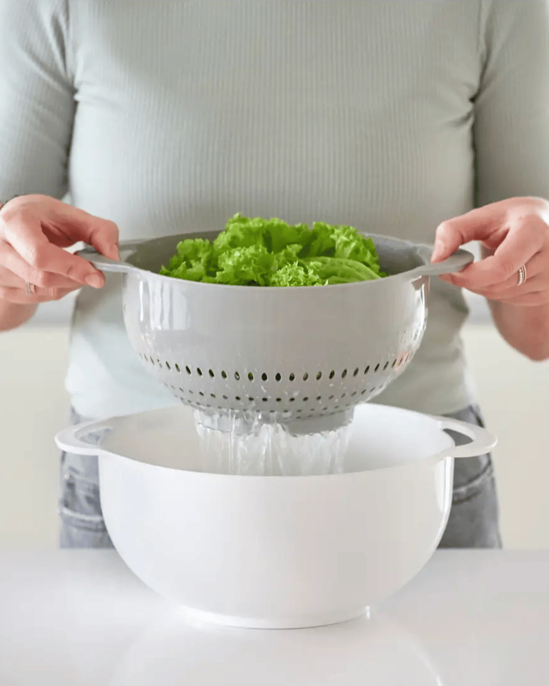 Detta multifunktionella köksset är ett smart och praktiskt val för dig som vill ha ordning, funktion och flexibilitet i köket. Setet innehåller en citruspress, uppsamlingsbricka, fin sil, pastaslidare och en skål – allt du behöver för flera vanliga köksmoment, samlat i ett enda köksredskap.