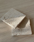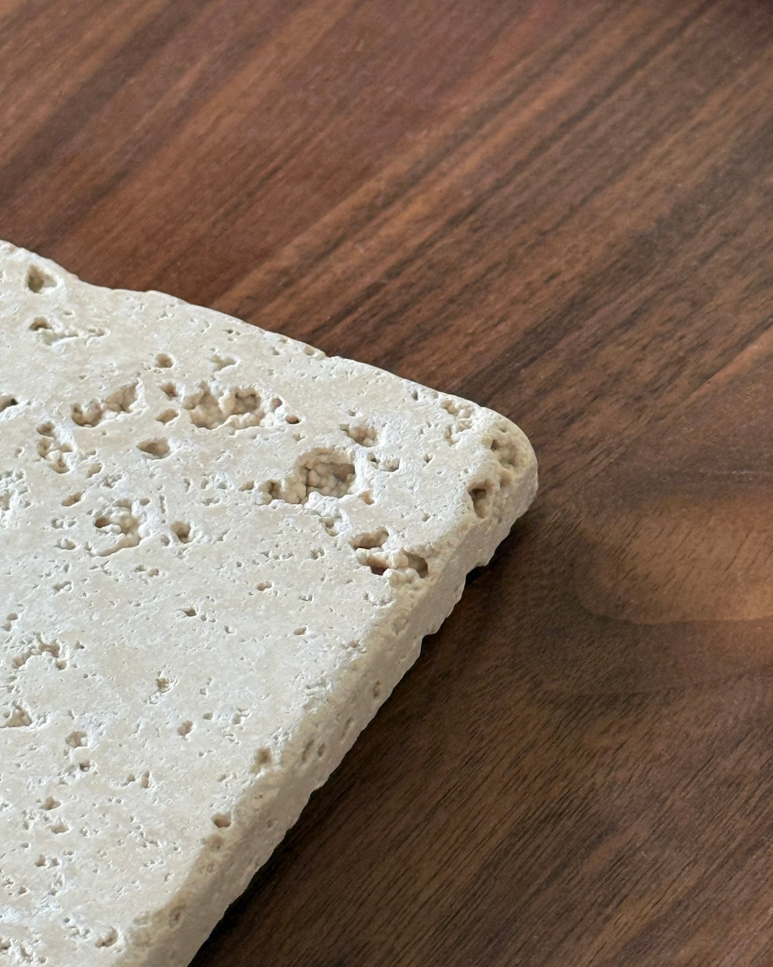 Det här underlägget är lika praktiskt som det är dekorativt – använd det som tvålbricka i badrummet, som stilfull bas för dina ljus eller som ett exklusivt underlägg till glas och koppar. Travertinens robusta men mjuka uttryck gör att den passar in i både moderna och klassiska hem.