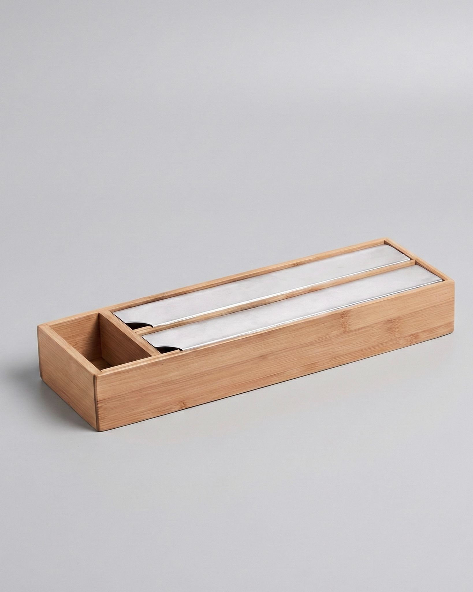 Det eleganta bambumaterialet ger inte bara ett stilfullt intryck utan skyddar även din folie från att bli utsatt för vatten och smuts. Den inbyggda rostfria stålkanten säkerställer att avrivningen går smidigt utan att riva eller skada folien.