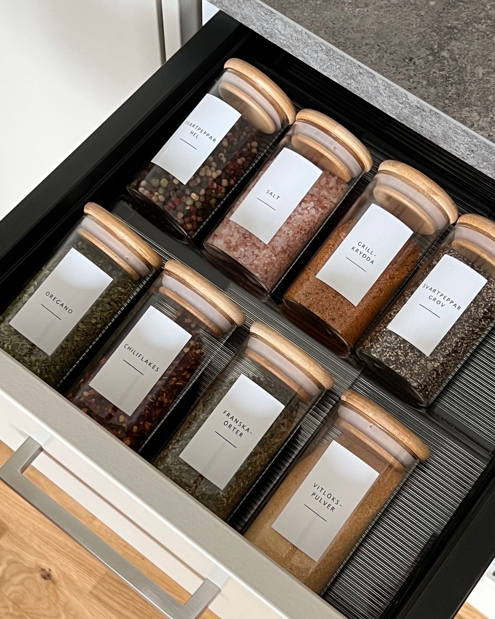 För extra organisation, komplettera med våra eleganta kryddetiketter. De är enkla att fästa och tål handdisk. Förvara dina burkar i vår justerbara kryddburksförvaring för en ännu mer strukturerad köksoas.