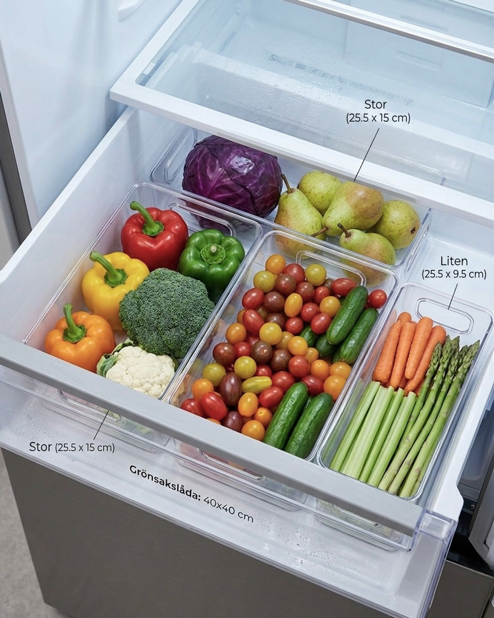 Den genomskinliga designen ger dig en snabb överblick över innehållet, vilket sparar tid när du letar efter ingredienser eller snacks. Perfekt för att hålla frukt, grönsaker och andra livsmedel organiserade och lättillgängliga.