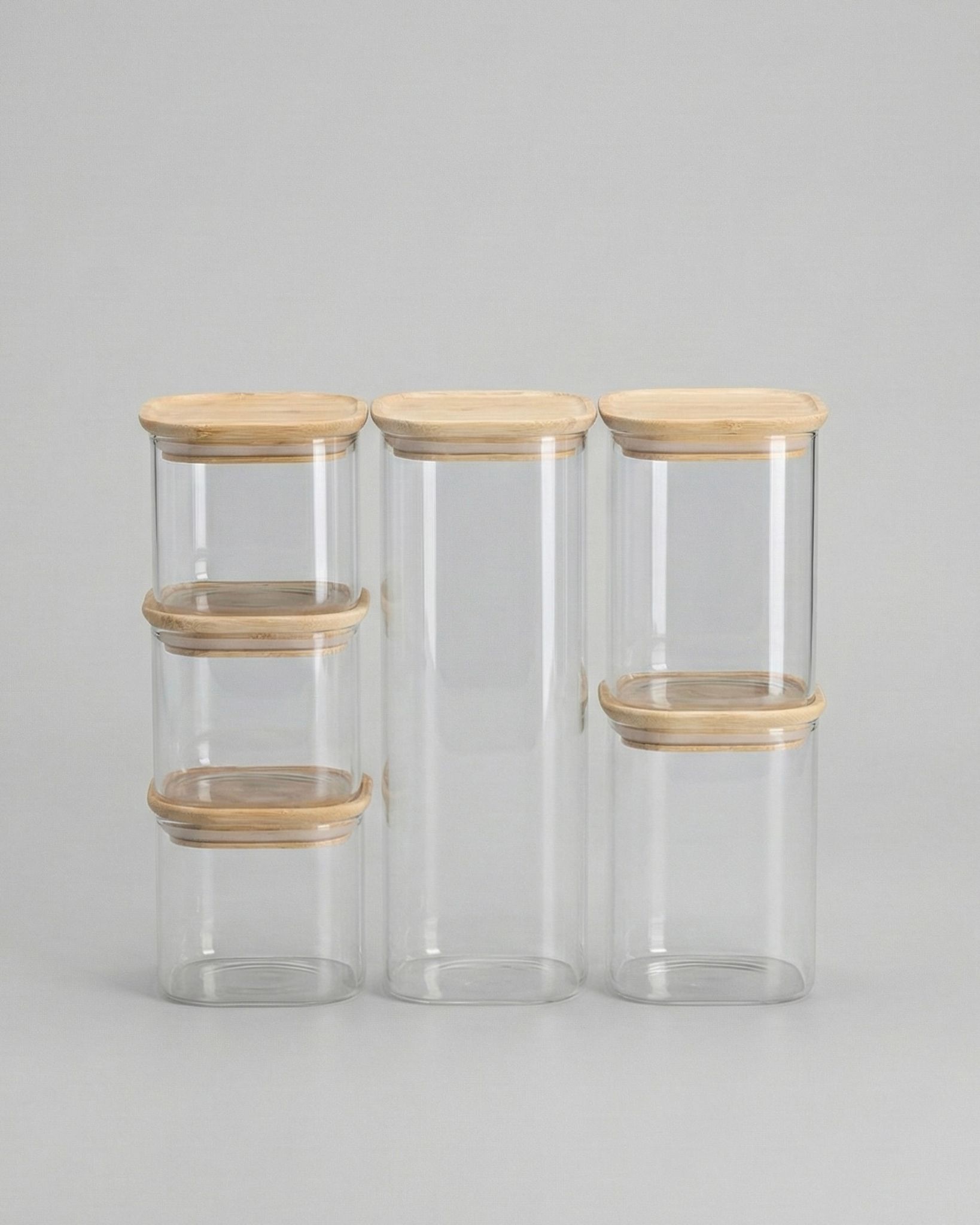 - Hållbara material: Tillverkade av klart glas för enkel överblick och naturliga bambulock för en miljövänlig touch.