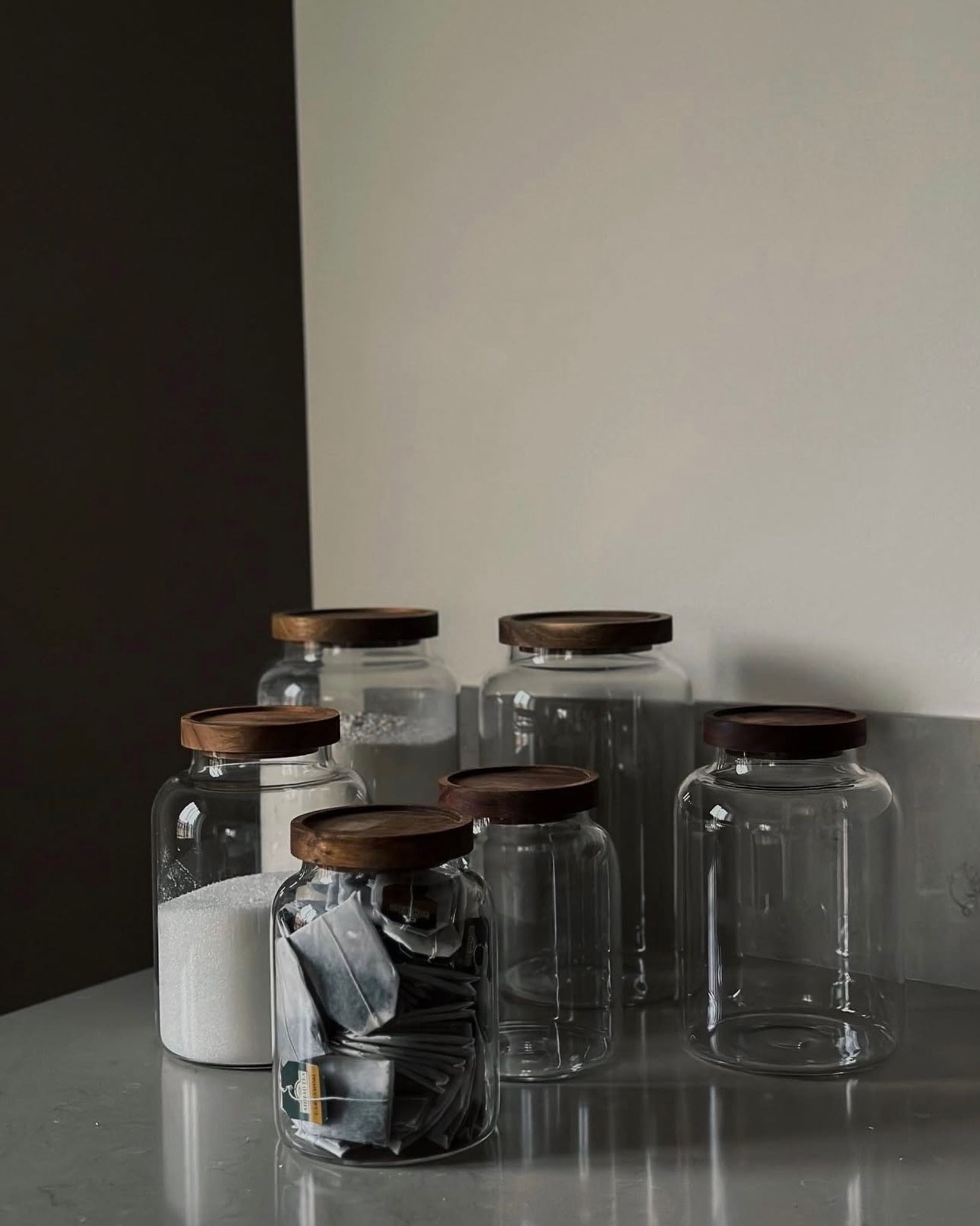 - Dekorativa glasburkar med lufttäta lock i Akaciaträ.