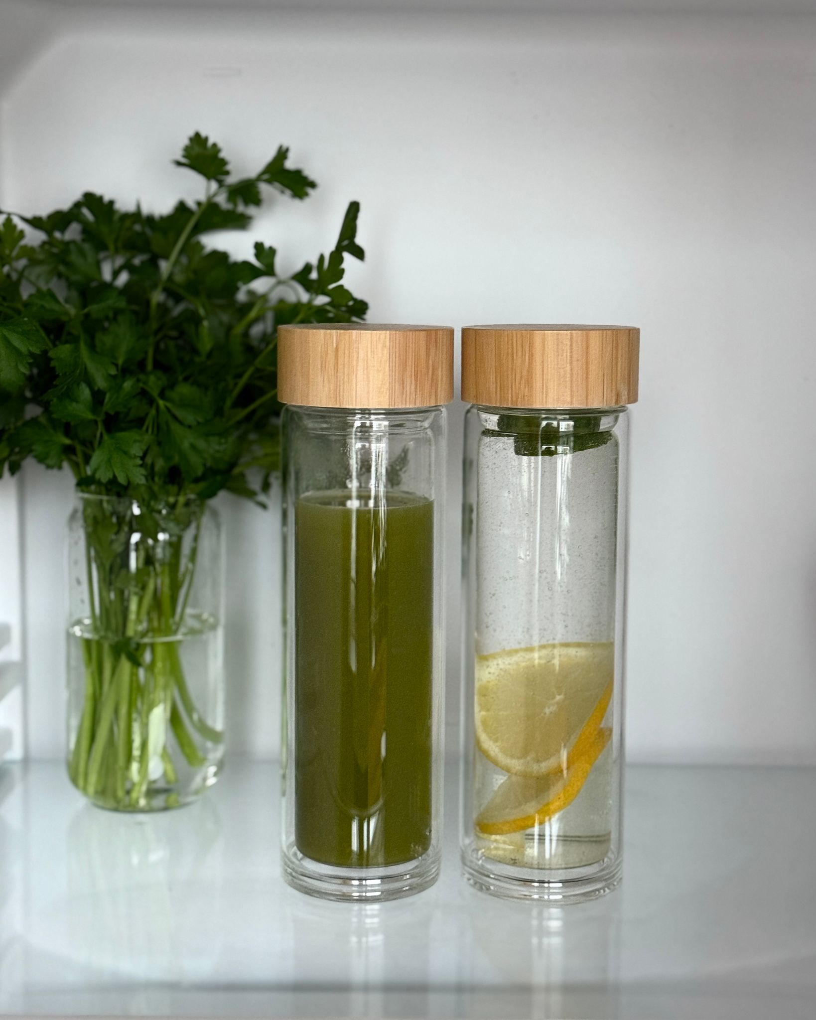 Flaskans lock är tillverkat av vacker bambu och har en silikonkant som säkerställer en tätslutande försegling, vilket förhindrar läckage. För dem som föredrar kalla drycker kan flaskan användas för att smaksätta vatten med frukt, bär eller örter som myntablad och citron. Den kompakta designen gör den lätt att förvara i väskan eller ryggsäcken.