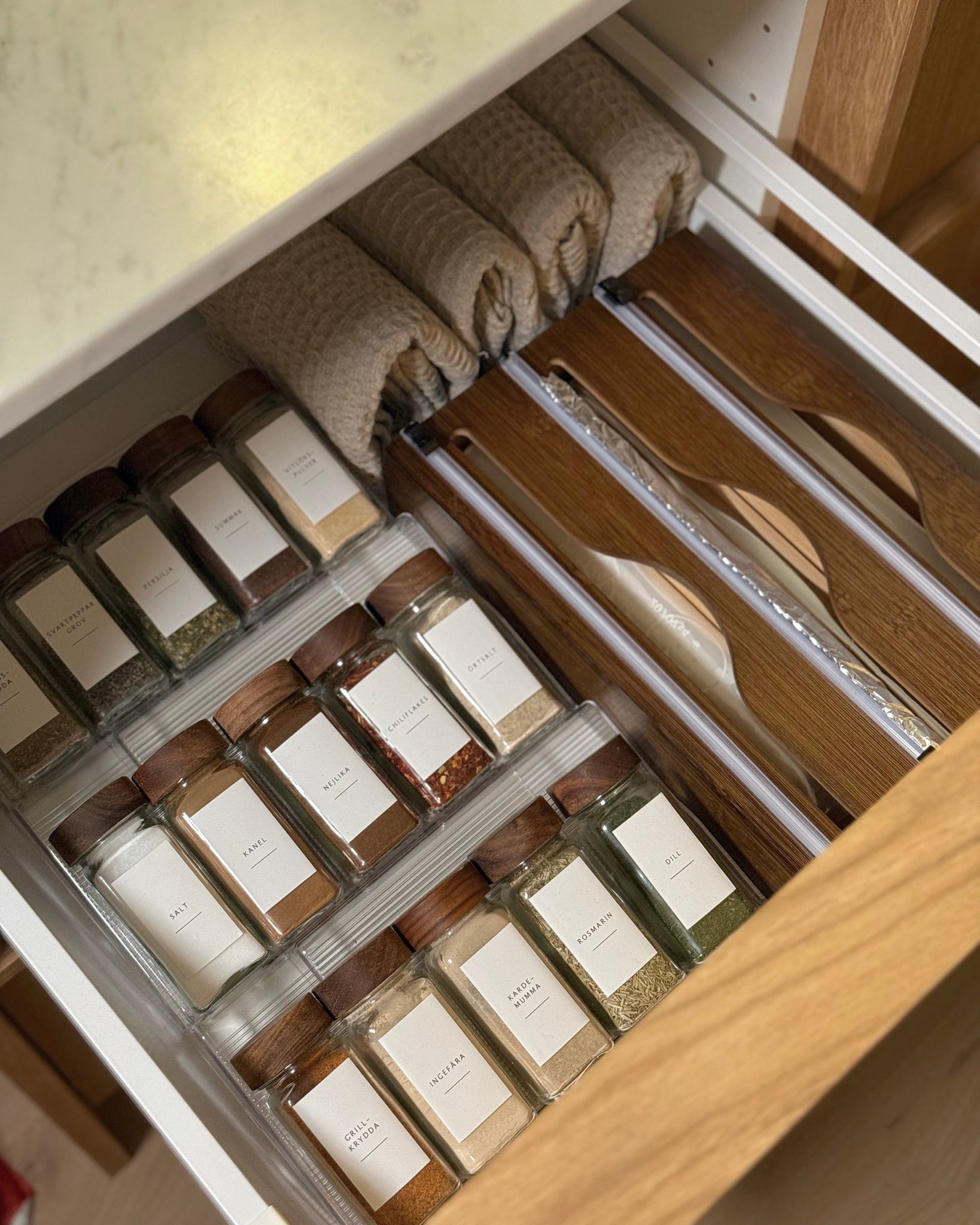 Upptäck vår Köksstation i valnötsfinish, en perfekt lösning för att hålla ditt kök organiserat och stilrent. Denna allsidiga station inkluderar ett praktiskt kryddställ med matchande burkar, en behållare för folie och bakplåtspapper samt ett set med etiketter för tydlig märkning. Den eleganta valnötsfinishen ger en varm och naturlig känsla som passar perfekt i det moderna skandinaviska hemmet.