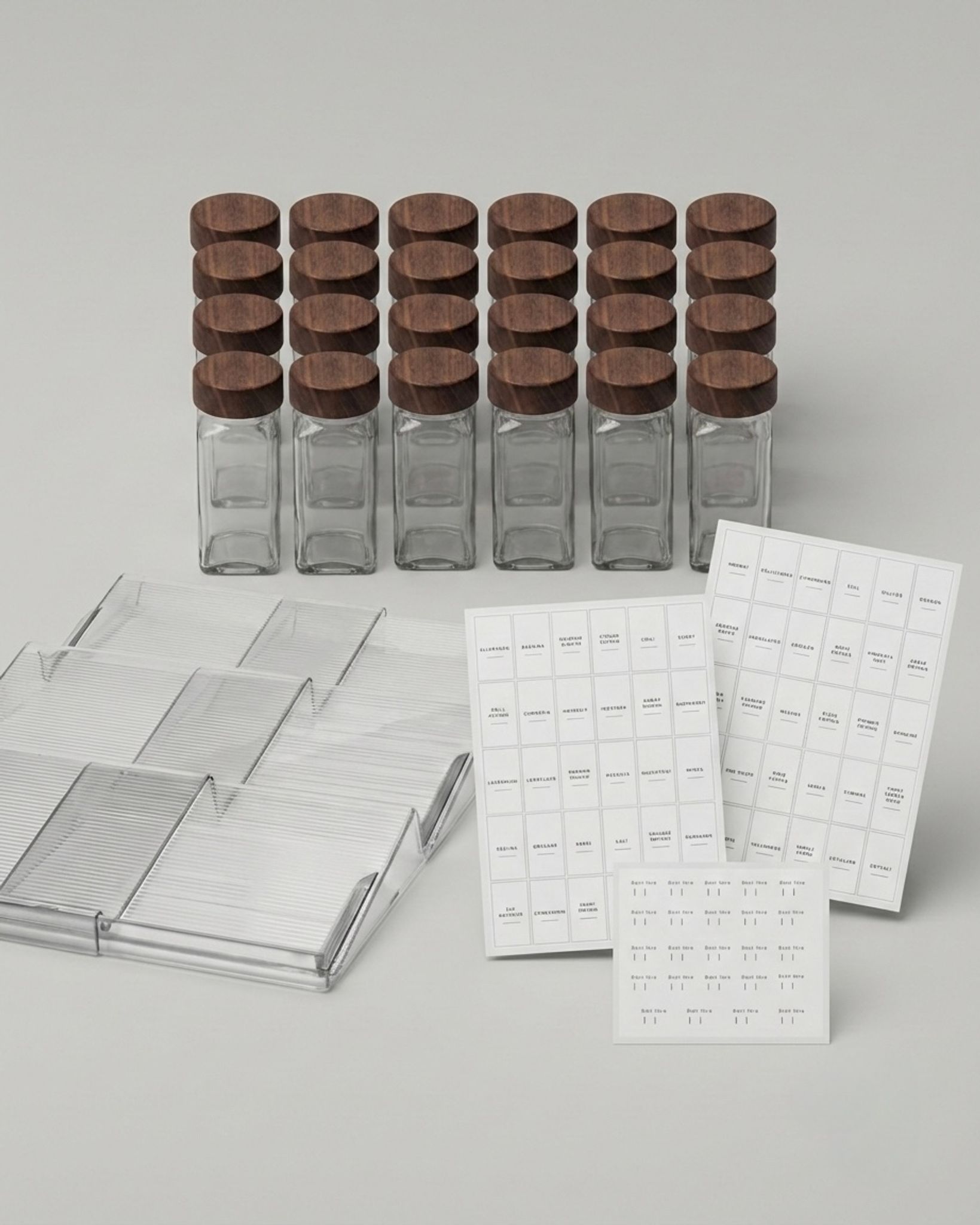 Denna serie av 24 stycken lufttäta kryddburkar i glas med eleganta etiketter blir både ett perfekt dekorativt inslag i din inredning och den mest funktionella förvaringen av dina kryddor. Det tätslutande och stilrena locket i valnöt försäkrar att innehållet behåller sin arom och inte blir fuktigt.