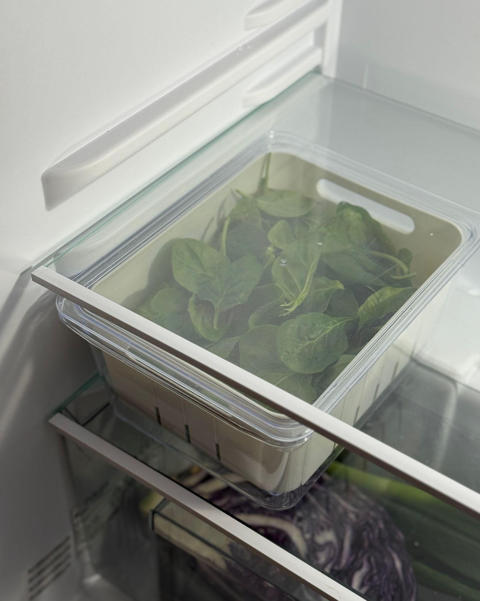 Håll grönsaker och sallad fräscha längre, inbyggt durkslag