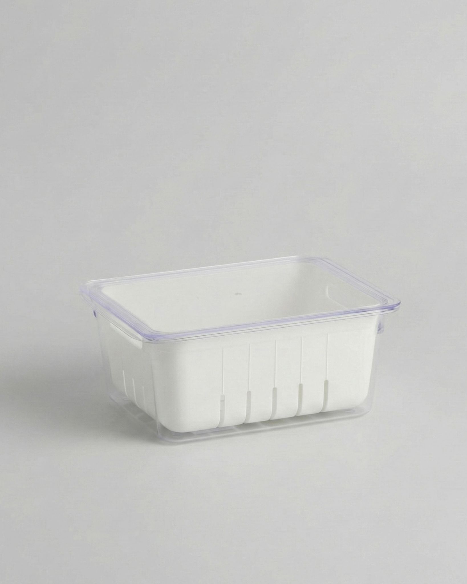 Lådan är tillverkad i ett klart, robust plastmaterial som gör det enkelt att se innehållet. Den stapelbara designen med transparent lock möjliggör maximal överblick och hjälper dig att organisera kylen som ett proffs. Skölj frukt och grönsaker direkt i durkslaget och placera det sedan i lådan för en smidig och tidsbesparande process.
