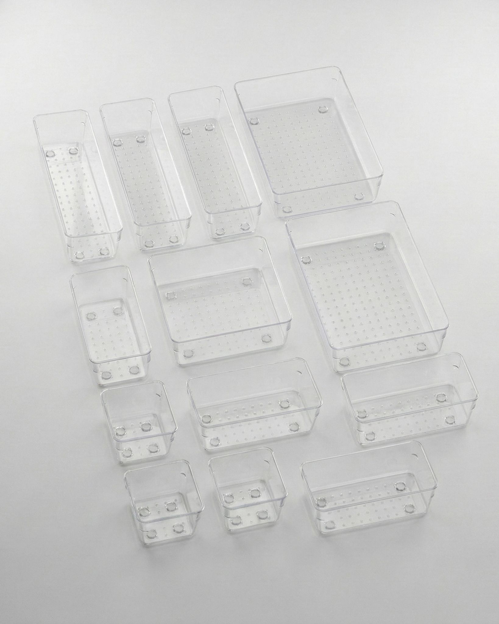 Skapa ordning i ditt hem med denna transparenta lådinsats i 5 olika storlekar i 13-delar slitstark BPA-fri plast – en praktisk och stilren lösning för att hålla småsaker organiserade i lådor, skåp eller hyllor. Perfekt för allt från smycken, kontorsmaterial och smink till barnens pyssel och tillbehör, oavsett rum.