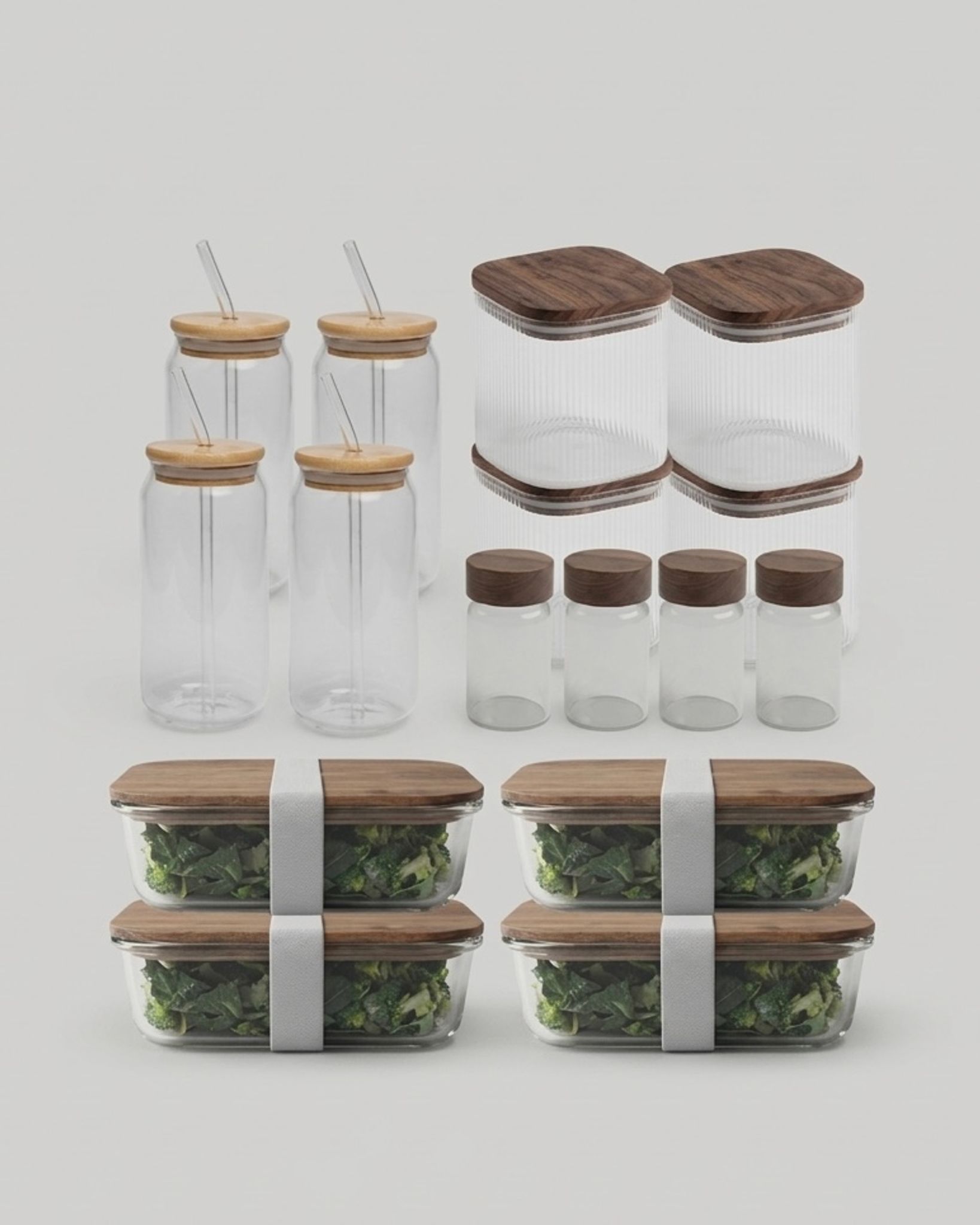 Organisera ditt kök med vårt mealprep-kit i glas, en perfekt lösning för dig som älskar att förbereda måltider i förväg. Detta set innehåller eleganta glasbehållare med vackra trälock som förhöjer både funktion och estetik i ditt kök. Det hållbara glaset är perfekt för att hålla maten fräsch längre, medan de tätförslutande locken säkerställer att inget läcker ut.