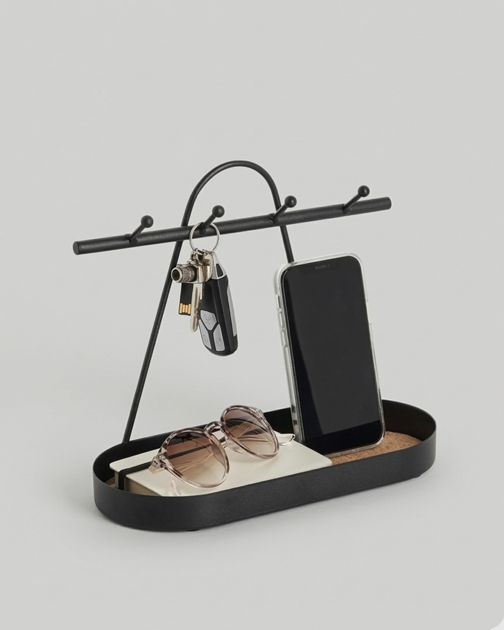 Har du tappat bort nycklarna igen? Med vår stilrena förvaring i svartlackerad metall slipper du den frustrationen. Denna praktiska lösning är designad för att hålla dina nycklar, mobiltelefon, glasögon, och andra småsaker organiserade och lättillgängliga.