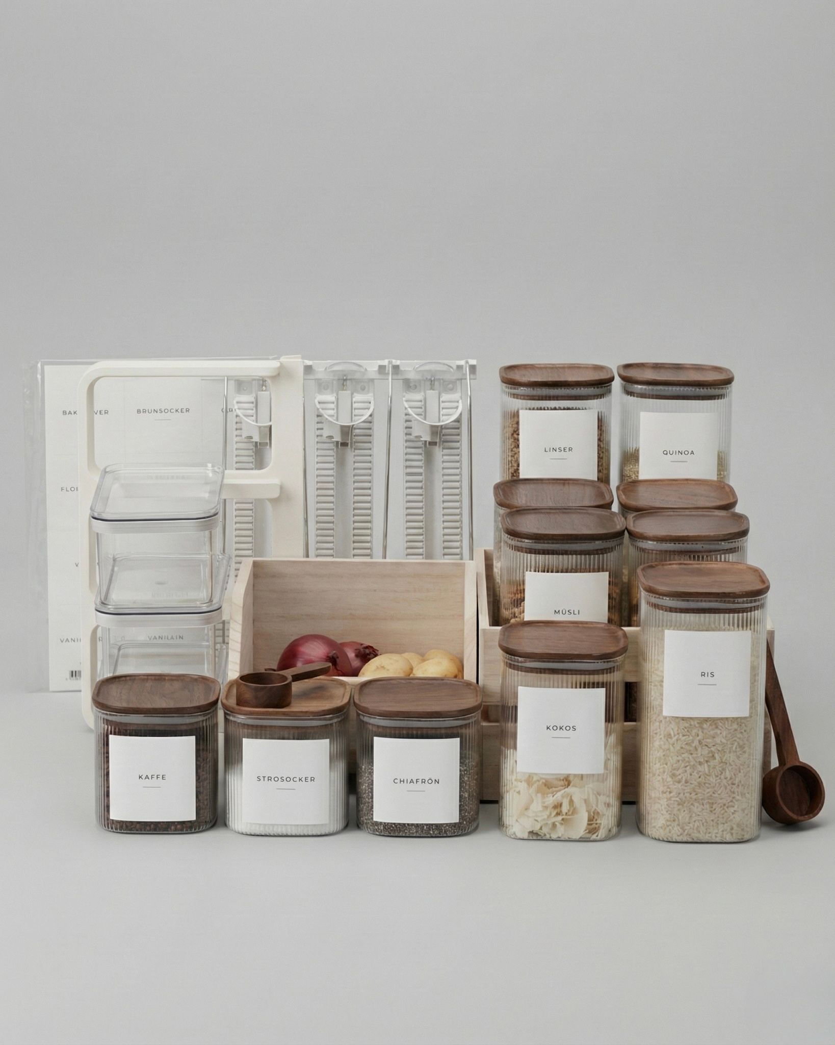Innehåller de viktigaste burkarna för att få ordning på de vanligaste torrvarorna.