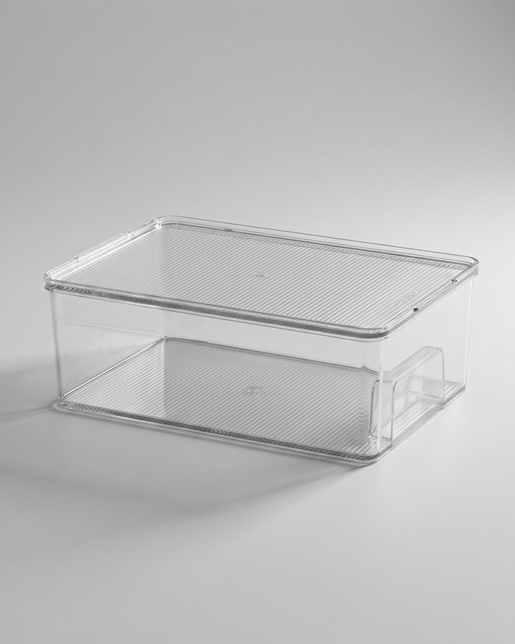 Upptäck vår stapelbara förvaringslåda med lock, designad för att maximera din förvaring och organisering. Tillverkad av transparent och robust BPA-fri plast, gör den enkelt att se innehållet utan att öppna locket. Den fyrkantiga formen med subtila randdetaljer ger ett stilrent intryck och passar perfekt i kylskåp, skafferier eller på kontoret. Locket sluter tätt för att skydda och bevara dina artiklar, från livsmedel till barnleksaker. Den stapelbara designen sparar plats och ger ett organiserat utseende i alla utrymmen.