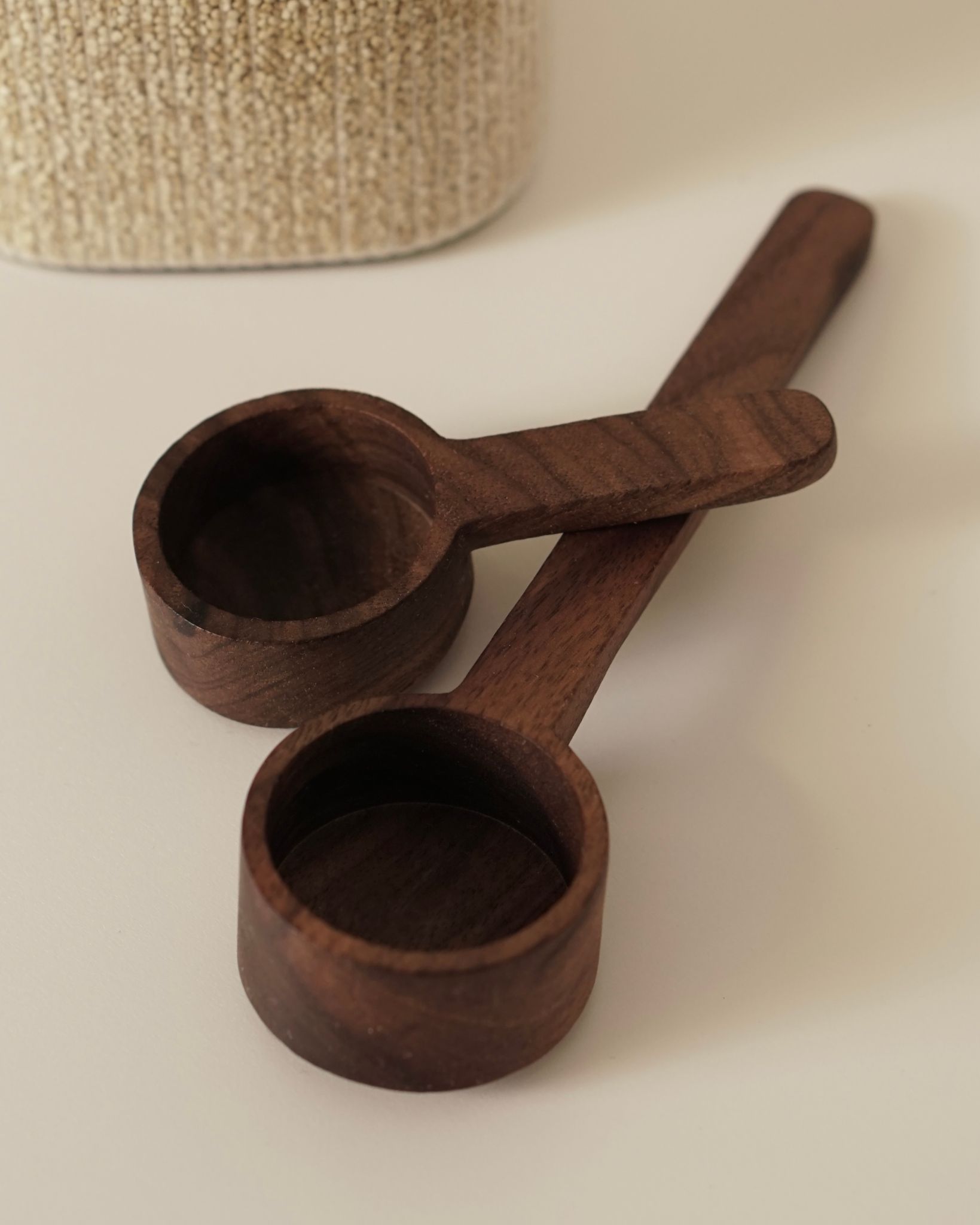 Denna träsked i valnöt på 9.5 cm är den perfekta blandningen av funktionalitet och stil. Med sin mörka, rika valnötsfinish är den en elegant tillskott till varje kök. Träskedens kompakta storlek gör den idealisk för både servering och exakt måttagning, vilket visas i bilderna där den används för att servera både quinoa och såser. Skedens rundade form ger en bekväm grepp och enkel hantering, vilket gör den perfekt för både dagligt bruk och speciella tillfällen. Oavsett om du använder den för att måtta kaffe eller servera småsaker vid middagsbordet, erbjuder denna sked en stilren lösning med naturlig charm.