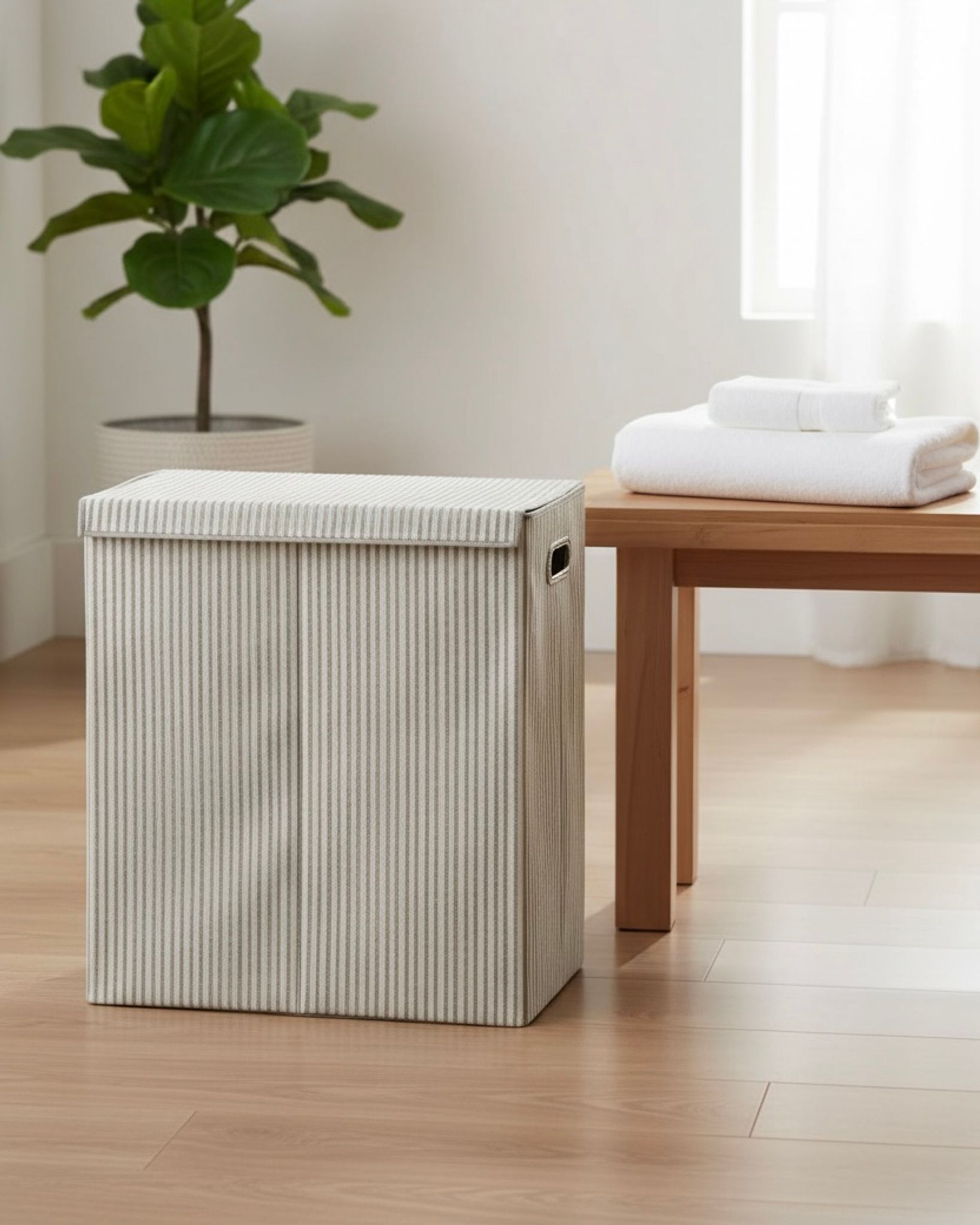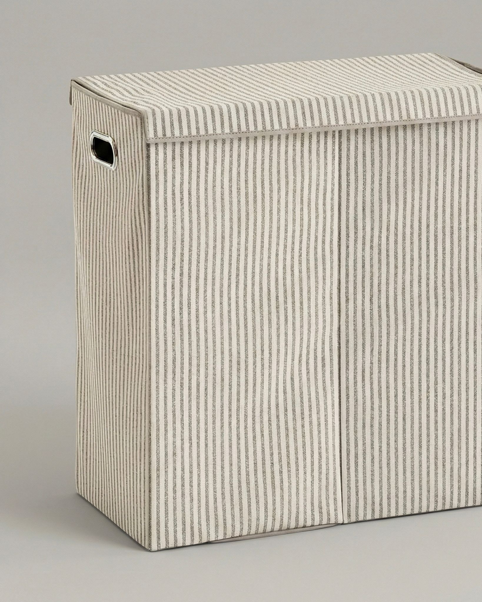 Upptäck vår tvättkorg med 2 fack, perfekt för ett organiserat och stilrent hem. Tillverkad av slitstarkt och estetiskt tilltalande material, denna tvättkorg förenklar din vardag genom att erbjuda två separata fack för enkel sortering av tvätt. Den neutrala, randiga designen smälter in i alla hem och bidrar till en ordningsam känsla i tvättstugan.