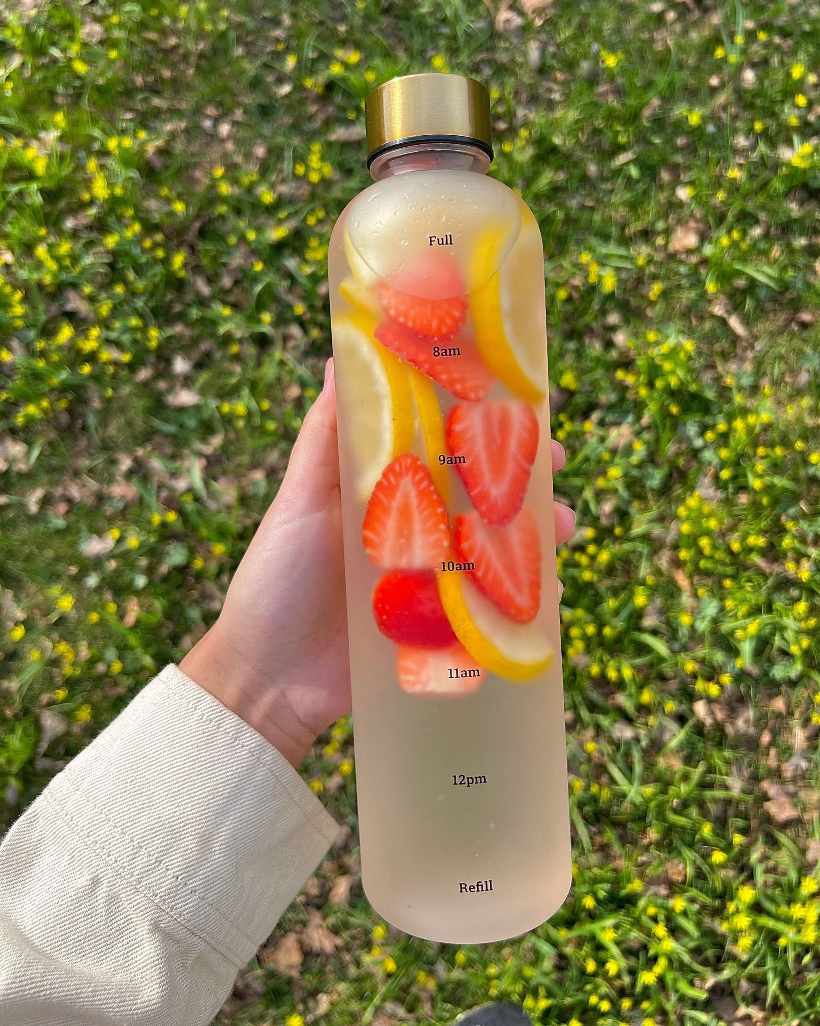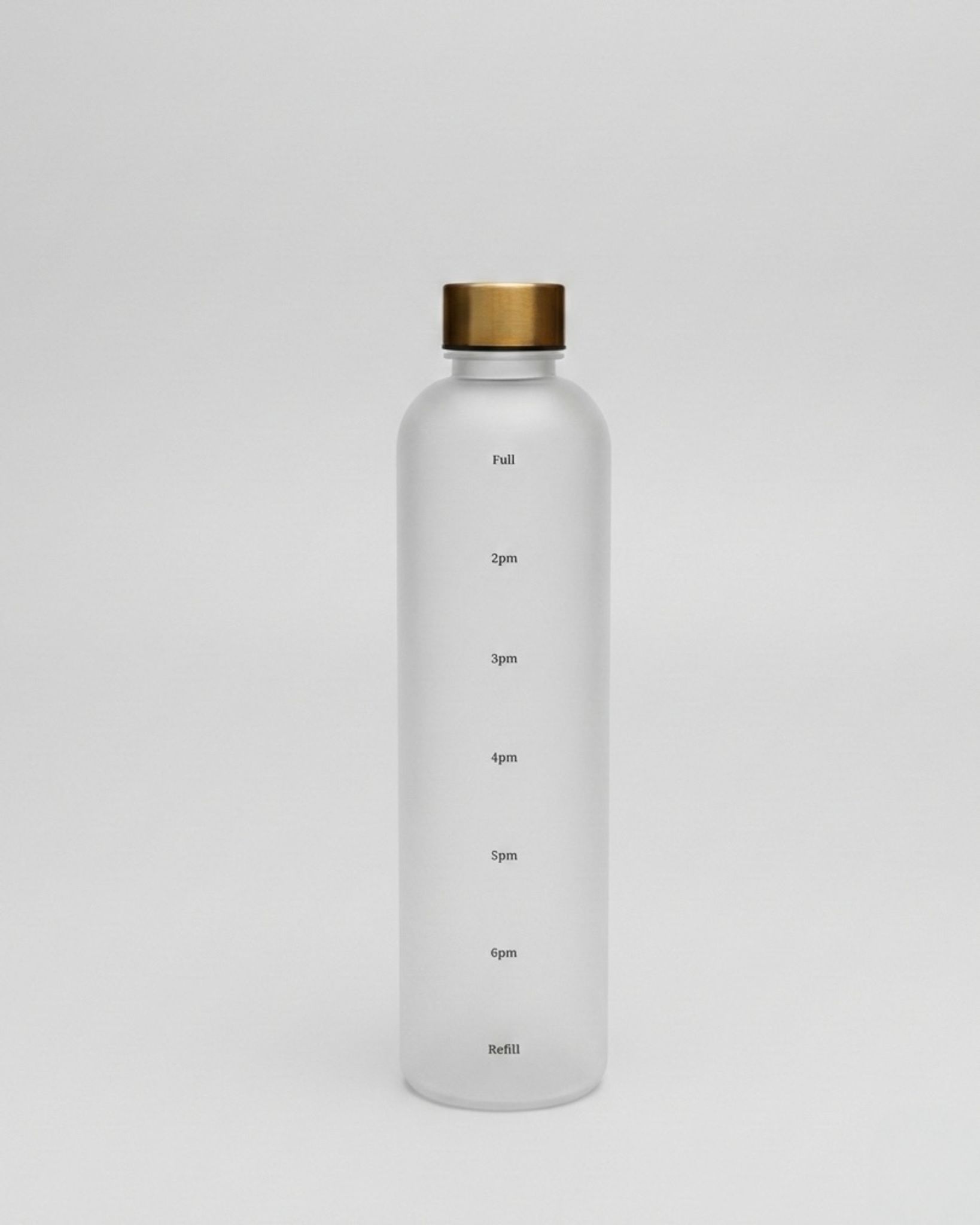 - Frostad vattenflaska med tidsmarkör för att mäta ditt dagliga intag av vatten.
